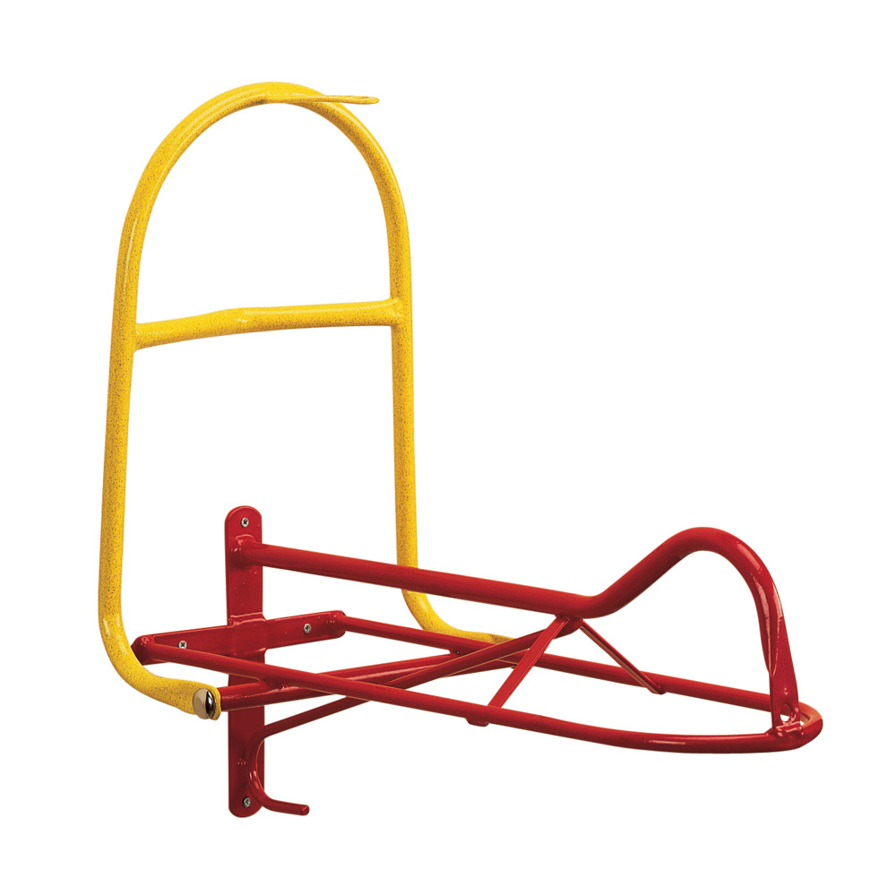 Significantly reduces theft and borrowing simply and smartly! Used conventionally until the deterrent arm is lowered and padlock inserted (lock not supplied). STUBBYFINE coated steel: Saddle Rack in Red or Black. Security Bar in high visibility Yellow. (HS Code: 83024900)