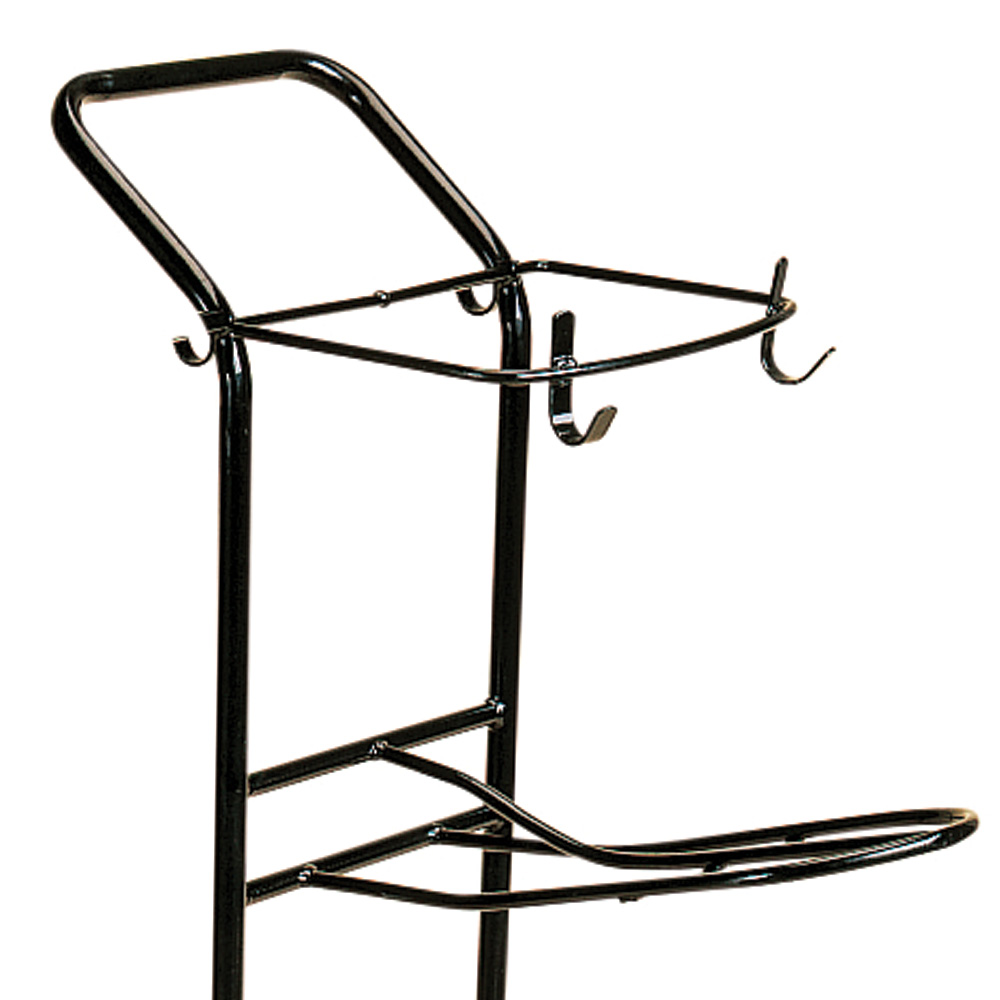 Very convenient tack transporter with saddle rack and bridle hooks. Base takes S57 Tack Box or other tray. Top takes S5H Grooming Bucket or other tack box. Black STUBBYFINE coated steel construction. Fits bow fronted tack boxes. (HS Code: 87168000)